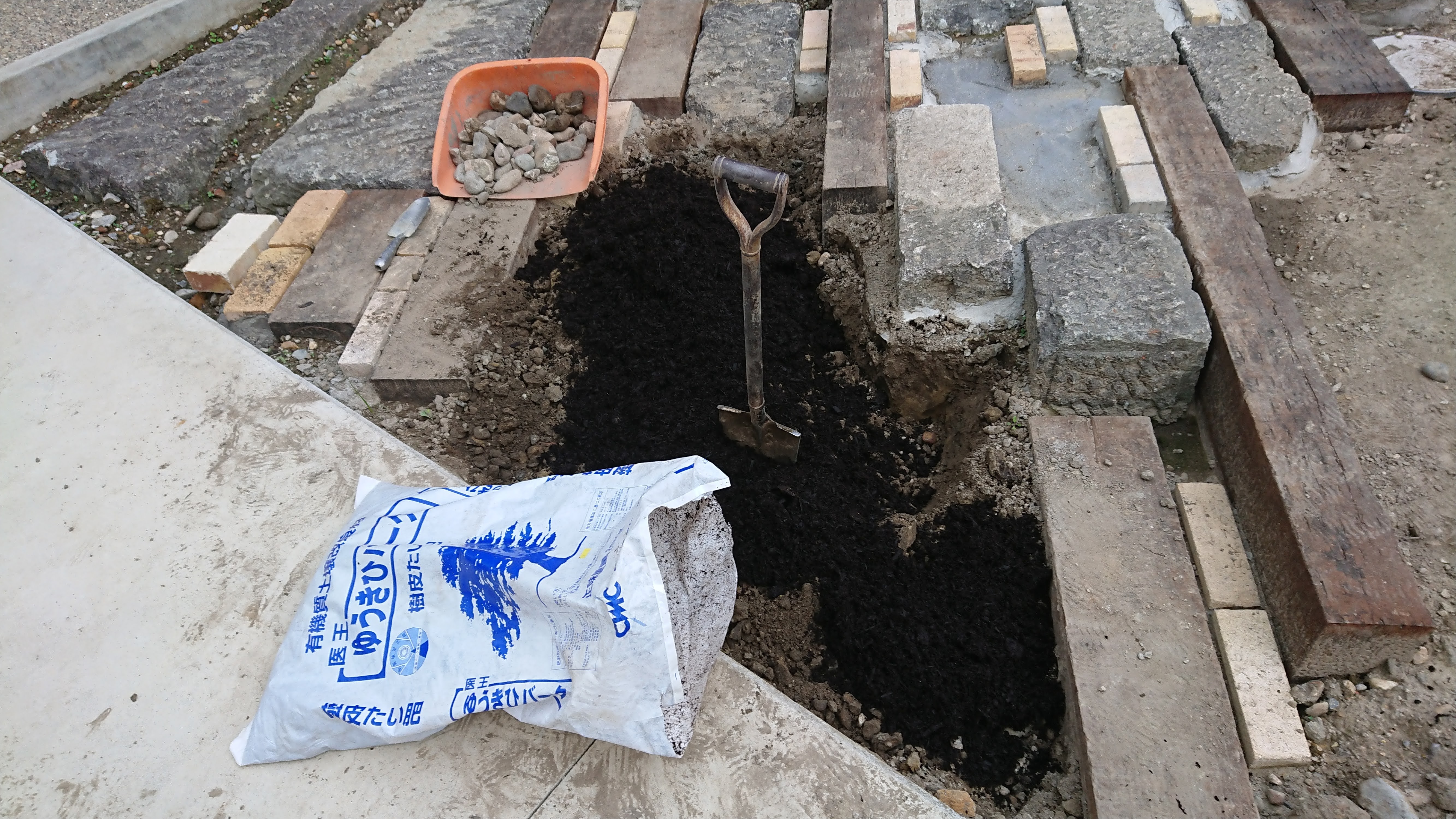 植栽箇所は広めに耕して、バークたい肥と牛糞たい肥をたっぷり鋤き込む。また湿りがちな土中へ酸素を積極的に供給するため、樹木の近くには長さ1m程の太い竹を(縦に割いて、節をくり抜く)数本埋め込んだ。