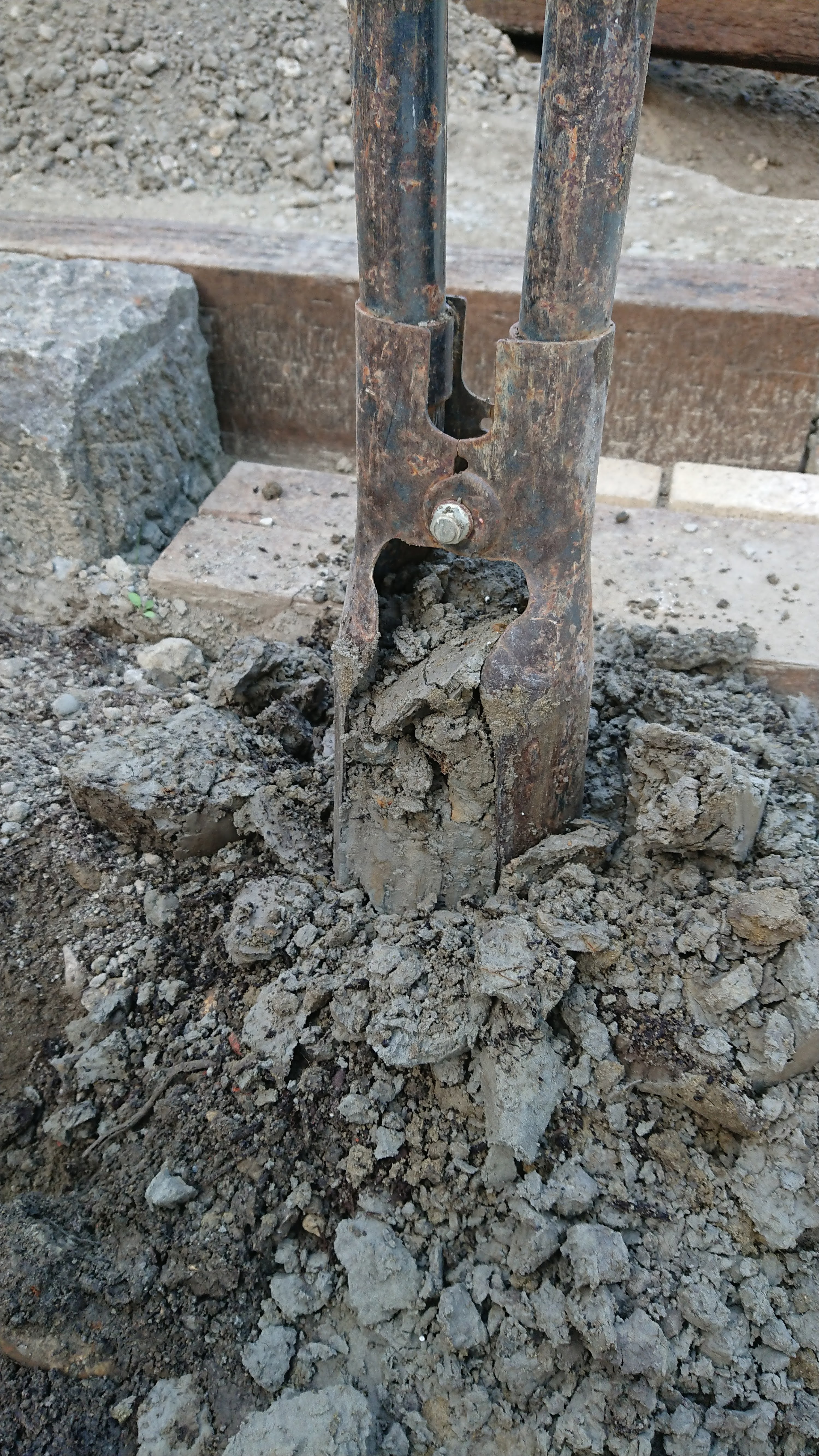 新しく造成された住宅地であるため、土壌はガチガチに固められた山土砂で現状は植栽に不向きである。試しに穴を掘ってみたが、ミミズなどの土壌小動物は全く見られず、地下1m近く掘ると粘土の層があり、さらに進むとしだいにじわじわと水が染み出してくることがわかった。日当たりは南向きで良好。